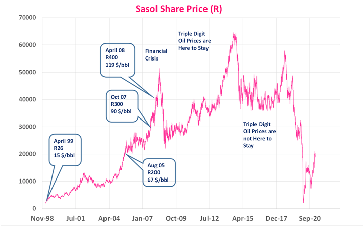 I started the graph in April 1999 when I was 38 and the share price was R26 and the oil price was $15/bbl. The significance of this date is that I was awarded a large number of share options at R26 (it would be vulgar to reveal how many). From there the oil price began a dramatic rise over the next 9 years and the share price passed R400 in April 2008 when the oil price was $119/bbl. I confess to cashing in most of my share options above R400. Many of my true blue colleagues of our generation hung on to their shares but I confess to the disloyal act of diversifying my assets offshore.