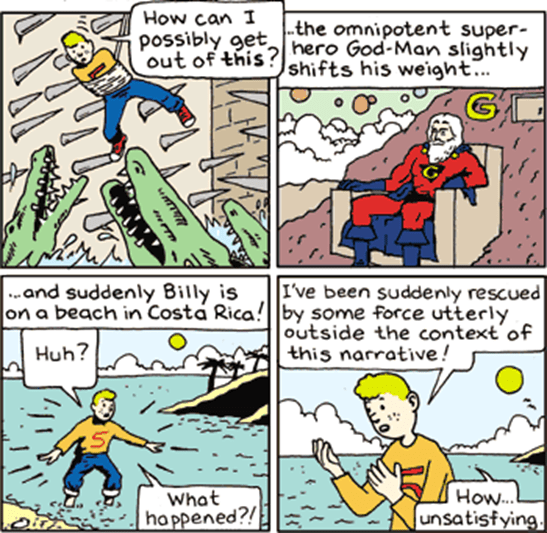 I will argue today that some of the dominant climate change mitigation narratives are using a Deus ex machina approach to the problem of climate change. So first a slight detour into what Deus ex machina means. Deus ex machina arose out of Greek theatre and is a plot device when a hopeless situation is suddenly solved by an unexpected occurrence like divine intervention. It is an easy way to get out of difficult situations and can often be a sign of “lazy writing” or used as a comedic device.